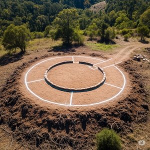 A circular trench with a low foundation of gravel or compacted rubble being laid.