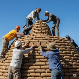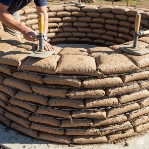 Fill durable bags with locally sourced earth (ensuring a suitable composition, often a mix of clay, sand, and silt). Securely close the bags. Lay the first circular course of bags tightly, end-to-end, on the prepared foundation. Firmly tamp down each bag using a tamper (a heavy, flat-bottomed tool for compaction). Place two strands of barbed wire between each layer of bags to provide tensile strength and prevent movement.